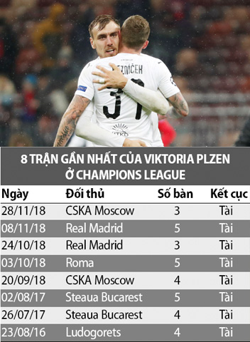 8 trận gần nhất của Viktoria Plzen tại Champions League (bao gồm cả vòng play-off) đã xuất hiện cả thảy tới 33 lần lưới rung, tức trung bình lên tới 4,125 bàn/trận và không trận nào chấm dứt với ít hơn 3 bàn thắng. Khi Viktoria Plzen gặp các đối thủ mạnh như Roma, Real Madrid đã đành, họ gặp các đội trung bình như CSKA Moscow, Steaua Bucarest hay Ludogorets Razgrad cũng luôn xảy ra mưa gôn.