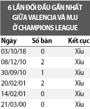 Xỉu trận Valencia - Man Utd 3/4 trận gần đây của Man Utd ở Champions League, 16/19 trận chính thức mùa này của Valencia và cả 6 lần đối đầu gần nhất giữa đôi bên tại Champions League đều chỉ có tối đa 2 bàn. Tại Champions League 2018/19, các trận có mặt Man Utd và Valencia có lần lượt 8 và 9 bàn, đều thuộc loại thấp nhất giải. Cuộc so tài đêm nay sẽ có số bàn thắng không đạt tới con số 2 bàn rưỡi (2 ½).