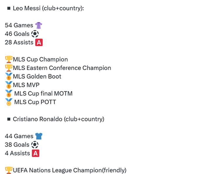 Trái ngược với Messi, trong năm 2025, Ronaldo chỉ giành được 1 danh hiệu tập thể là UEFA Nations League. Ngoài ra, CR7 cũng thua xa Messi về thành tích ghi bàn lẫn kiến tạo. Trước 2 trận cuối cùng của năm, Ronaldo ghi được 38 bàn thắng và chỉ có 4 pha kiến tạo sau 44 trận trên mọi đấu trường cho Al Nassr và ĐT Bồ Đào Nha. Như vậy để cân bằng thành tích ghi bàn của Messi, Ronaldo cần ghi thêm 8 bàn ở 2 trận còn lại của năm 2025.