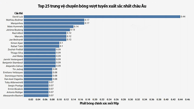 Hai người có tỉ lệ đường chuyền vượt tuyến thành công từ hàng thủ chỉ xếp sau Luiz là Mathieu Bodmer (Amiens SC) và Marquinhos (PSG) với cùng 0,17 lần. Các vị trí tiếp theo lần lượt thuộc về bộ đôi tới từ Bayern Munich là Mats Hummels (0,14) và Jerome Boateng (0,13). Thống kê này chỉ được tính đối với những trung vệ chơi ít nhất 900 phút ở mùa giải 2018/19.