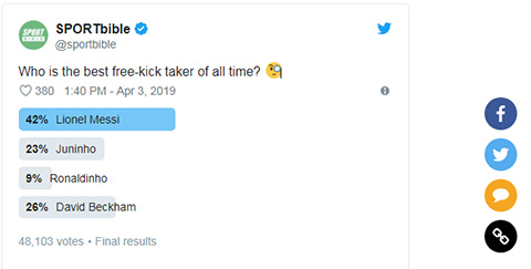 Theo kết quả cuộc thăm dò được trang Sportbible tổ chức, Messi đã giành vị trí quán quân trong danh sách các "vua sút phạt" khi nhận được tới 42% số phiếu bầu. Xếp sau cầu thủ sinh năm 1987 này lần lượt là Beckham (26%), Juninho (23%) và Ronaldino (9%).
