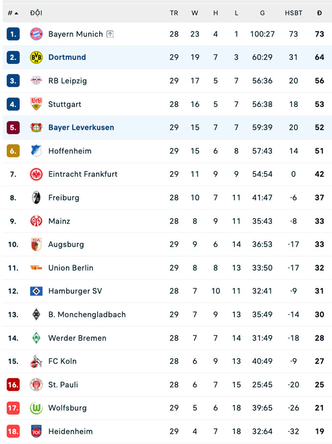 Về phía Leverkusen, chiến thắng quý giá này giúp họ vượt qua Hoffenheim để chiếm vị trí thứ 5. Với phong độ hiện tại, Leverkusen đang nổi lên như một thế lực thực sự trong cuộc đua top 4 tại Bundesliga, và chiến thắng ngay tại “chảo lửa” Dortmund là minh chứng rõ ràng cho tham vọng của họ.