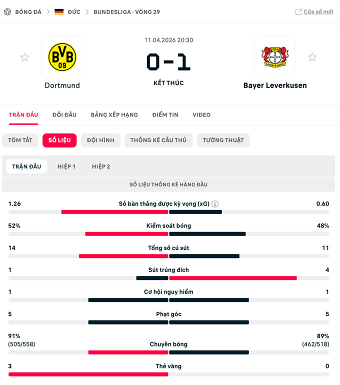 Trận cầu tâm điểm của vòng 29 Bundesliga diễn ra trong bầu không khí căng thẳng tại Signal Iduna Park, nơi Dortmund rất cần một chiến thắng để không bị Bayern bỏ quá xa. Tuy nhiên, trước một Leverkusen chơi kỷ luật và hiệu quả, đội chủ nhà đã không thể đạt được mục tiêu.