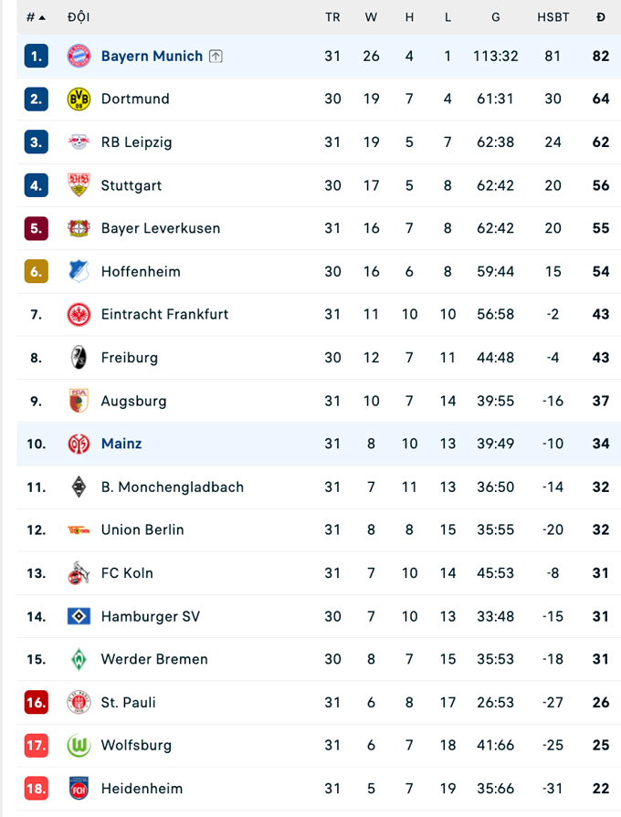 Về phía Mainz, dù thất bại, họ vẫn có thể ngẩng cao đầu sau màn trình diễn ấn tượng. Tuy nhiên, đội bóng này sẽ phải chờ thêm ít nhất một vòng đấu nữa để chính thức đảm bảo suất trụ hạng.