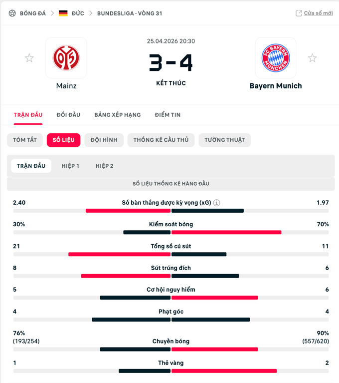 Dù đã sớm đăng quang Bundesliga, Bayern vẫn bước vào trận đấu với quyết tâm duy trì phong độ và hướng tới mục tiêu hoàn tất mùa giải trong thế thăng hoa. Tuy nhiên, những gì diễn ra trong hiệp một lại hoàn toàn trái ngược kỳ vọng của thầy trò Vincent Kompany.