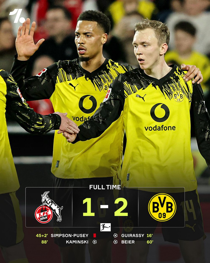Tuy nhiên, sai lầm của Johannesson sau đó đã mở ra cơ hội cho Dortmund phản công. Maximilian Beier có cú dứt điểm bị Tom Krauss phá ra chịu phạt góc, nhưng Cologne không thể giải nguy dứt điểm. Trong tình huống lộn xộn trước khung thành, Serhou Guirassy nhanh chân chọc bóng ghi bàn mở tỷ số cho Dortmund.