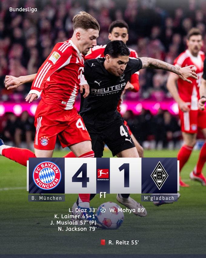 Bayern: Luis Diaz (33'), Laimer (45+1'), Musiala (57'-pen), Jackson (79')