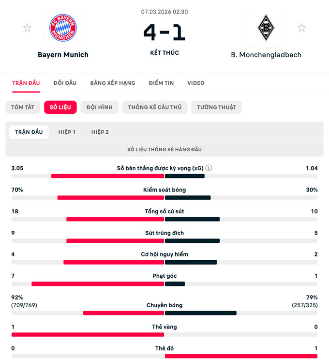 Dù không tạo ra quá nhiều cơ hội rõ ràng trong khoảng nửa giờ đầu trận, Bayern vẫn kiểm soát hoàn toàn thế trận và không cho đối thủ bất kỳ khoảng trống nào để triển khai bóng. Sức ép dần được cụ thể hóa bằng bàn mở tỷ số ở phút 35. Từ đường chuyền của Kim Min-jae ở rìa vòng cấm, Leon Goretzka thực hiện pha chích bóng tinh tế để Luis Diaz băng xuống tung cú volley đẹp mắt, đưa bóng găm vào góc xa khung thành Gladbach.
