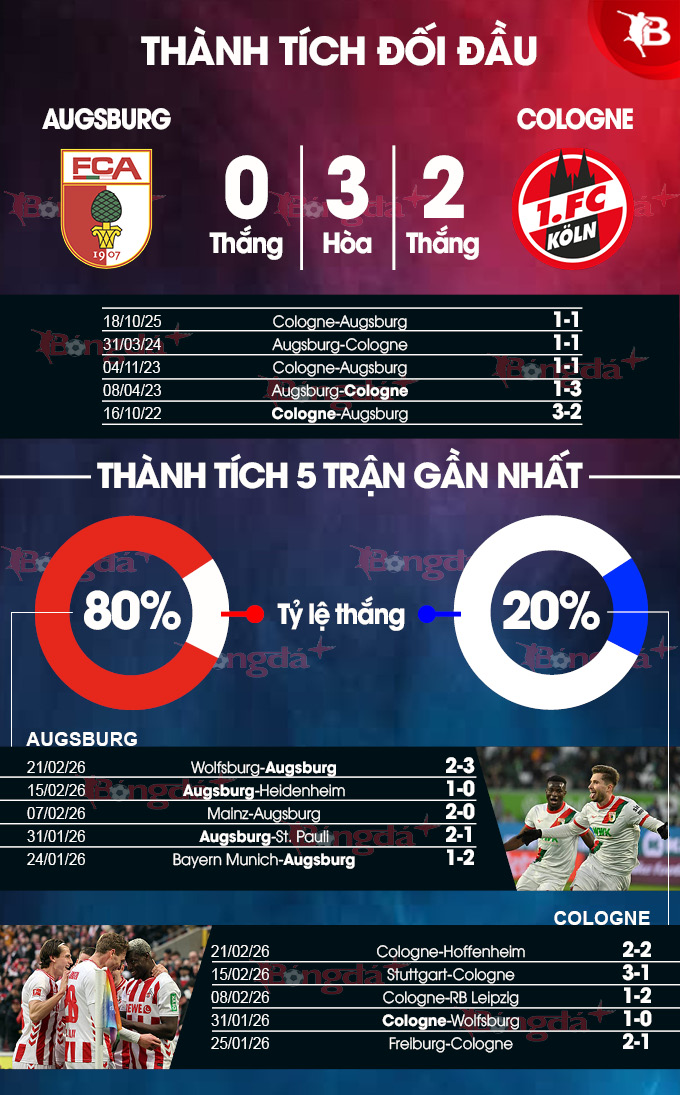 Trên sân nhà, Augsburg bất bại với mạch 7 trận liền không thua (hòa 3, thắng 4). Còn với Cologne, họ chỉ thắng 2/10 trận sân khách vừa qua. Xem ra, Augsburg có thể sẽ có niềm vui trước Cologne.
