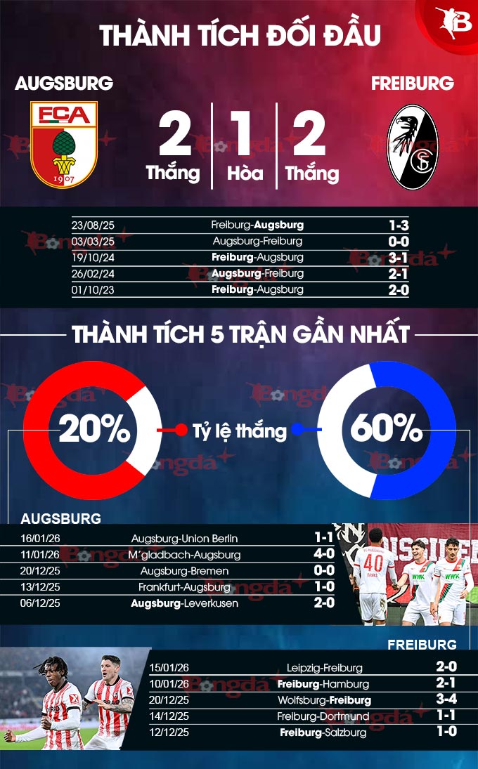 1. Freiburg chỉ thua 1, hòa 3 và thắng 2 ở 6 chuyến làm khách gần nhất trên sân của Augsburg ở Bundesliga.