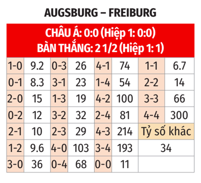 - Hai đội cùng ghi bàn: 5/8 cuộc đối đầu gần nhất, 3/4 trận gần đây của Freiburg đều có ít nhất 1 bàn thắng cho mỗi đội. Hơn nữa, 7/9 cuộc đụng độ vừa qua giữa hai đội tại Augsburg cũng chứng kiến tối thiểu 1 lần lưới rung cho mỗi đội. Trận này khó có ngoại lệ.