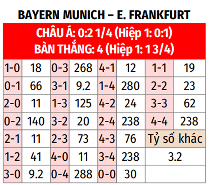 - Chẵn bàn thắng: 4/6 trận so tài gần nhất giữa 2 CLB có tổng bàn thắng chia hết cho 2. Chưa hết, 6/10 trận vừa qua của Bayern Munich lẫn 7/10 trận mới nhất của Frankfurt chứng kiến điều tương tự.