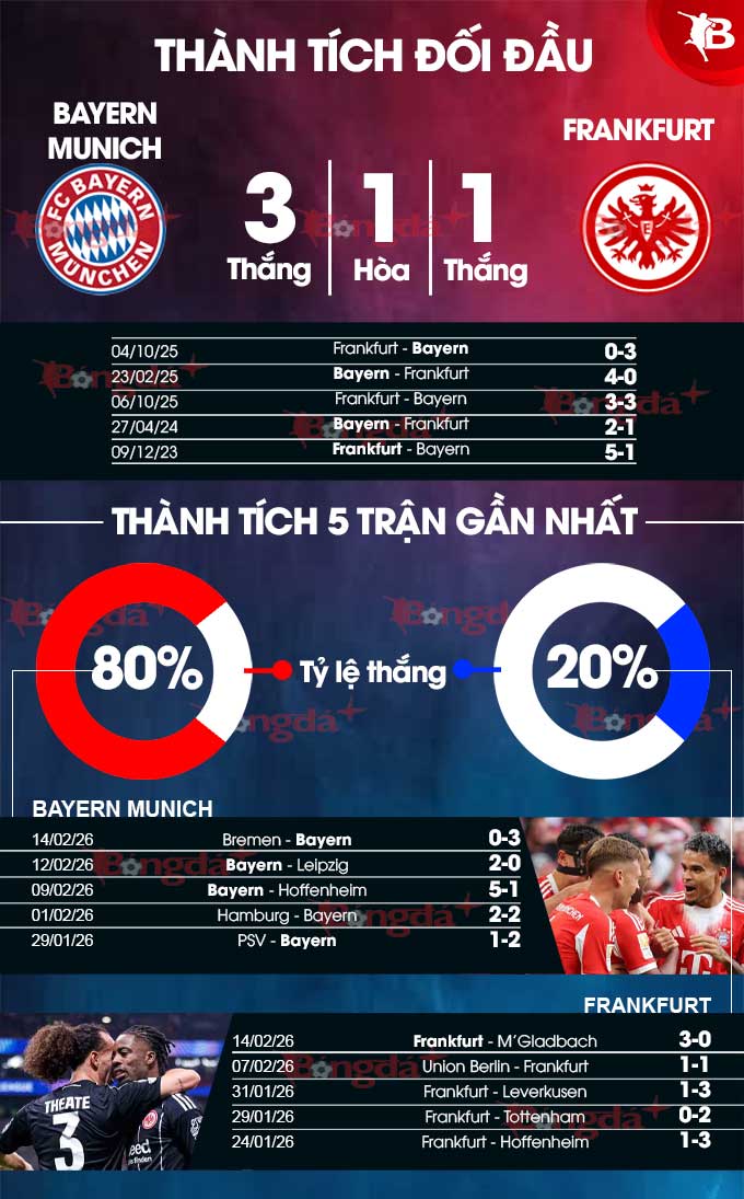 Chưa hết, ở 8 trận gần nhất gặp Frankfurt, Bayern thắng 5, hòa 2 và thua 1. Riêng 23 lần hành quân tới sân Allianz Arena của Bayern, Frankfurt thua tới 19, thắng 2 và hòa 2. Nhiều khả năng, 3 điểm sẽ lại về tay Bayern.