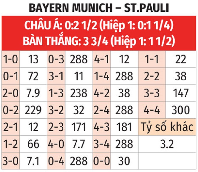 - Bayern Munich thắng châu Á hiệp 1: Các cầu thủ St. Pauli để thua theo châu Á ở 4 trận liên tiếp gần đây trong hiệp 1 tại Bundesliga. Lịch sử đối đầu cũng chứng kiến St. Pauli để thua châu Á 3/4 trận gặp Bayern Munich gần nhất trong hiệp 1.