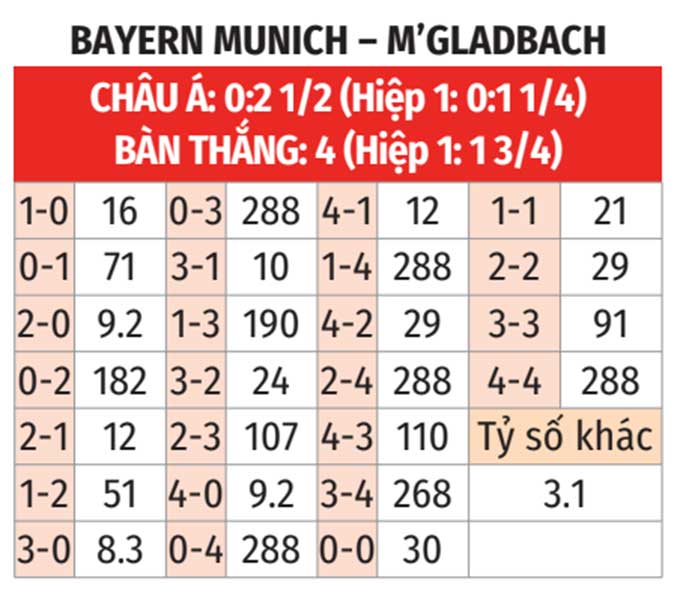 - Tỷ số lẻ: Cả 3 trận gần nhất của M'Gladbach đều kết thúc với tỷ số lẻ. 3 trận gần đây của Bayern cũng có số bàn thắng không chia hết cho 2.
