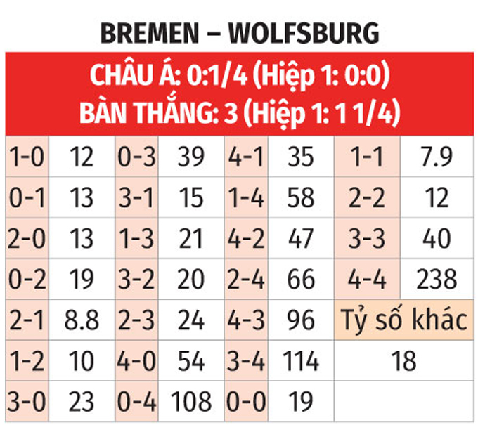 - Chẵn bàn thắng: 3/4 trận đối đầu gần nhất giữa có tổng bàn thắng chia hết cho 2. Ngoài ra, 5/8 trận vừa qua của Bremen chứng kiến điều tương tự.