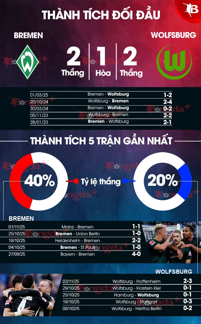 Trong khi Bremen chỉ thua 1/5 trận gần nhất thì Wolfsburg chỉ thắng 1/4 trận chính thức vừa xong. Bremen lại có lợi thế sân nhà và chỉ thua 1/4 trận gần nhất tại đây.
