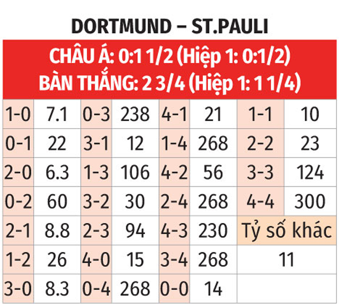 - Chẵn bàn thắng: 7/10 trận gần nhất của Dortmund có tổng bàn thắng chia hết cho 2. Ngoài ra, 6/10 trận sân nhà vừa qua của St.Pauli cũng chứng kiến điều tương tự.