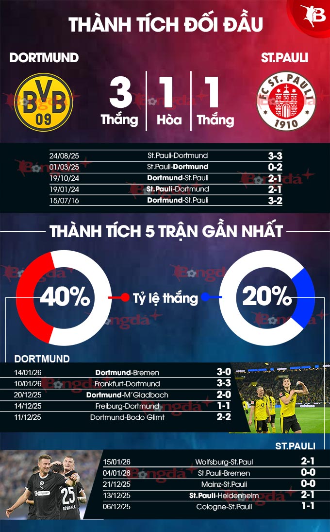 Xét về đối đầu trực tiếp, Dortmund thắng 7, thua 1 và hòa 2 trong 10 lần đụng độ vừa xong. Còn khi tiếp St.Pauli tại Signal Iduna Park, Dortmund bất bại với 3 thắng và 1 hòa. Xem ra lần này, St.Pauli sẽ lại tay trắng ra về.