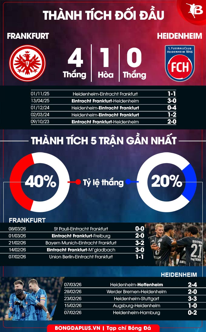 - Chẵn bàn thắng: 6/8 trận gần đây của Eintracht Frankfurt cùng 4/5 trận vừa qua của Heidenheim đều có tổng bàn thắng là chẵn. Kịch bản chẵn bàn thắng cũng diễn ra ở 4/6 trận đối đầu gần nhất.