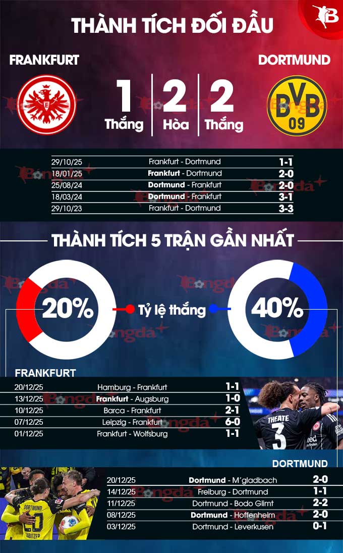 Nhưng nói vậy không có nghĩa là Frankfurt có thể dễ dàng khuất phục Dortmund. Đội bóng áo vàng đang trải qua mạch 8 trận liên tiếp bất bại ở Bundesliga, trong đó giành tới 5 chiến thắng. Nhờ thành tích ấy, họ đang xếp vị trí thứ 2 tại bảng xếp hạng sau Bayern Munich.