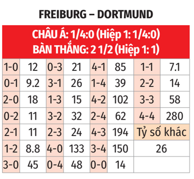 - Dortmund thắng theo châu Á: Freiburg thua theo châu Á ở 5/6 trận sân khách gần nhất tại Bundesliga. Ngoài ra, họ cũng thua theo châu Á ở cả 7 trận gặp Dortmund gần nhất nên không phải là sự lựa chọn đáng tin cậy.