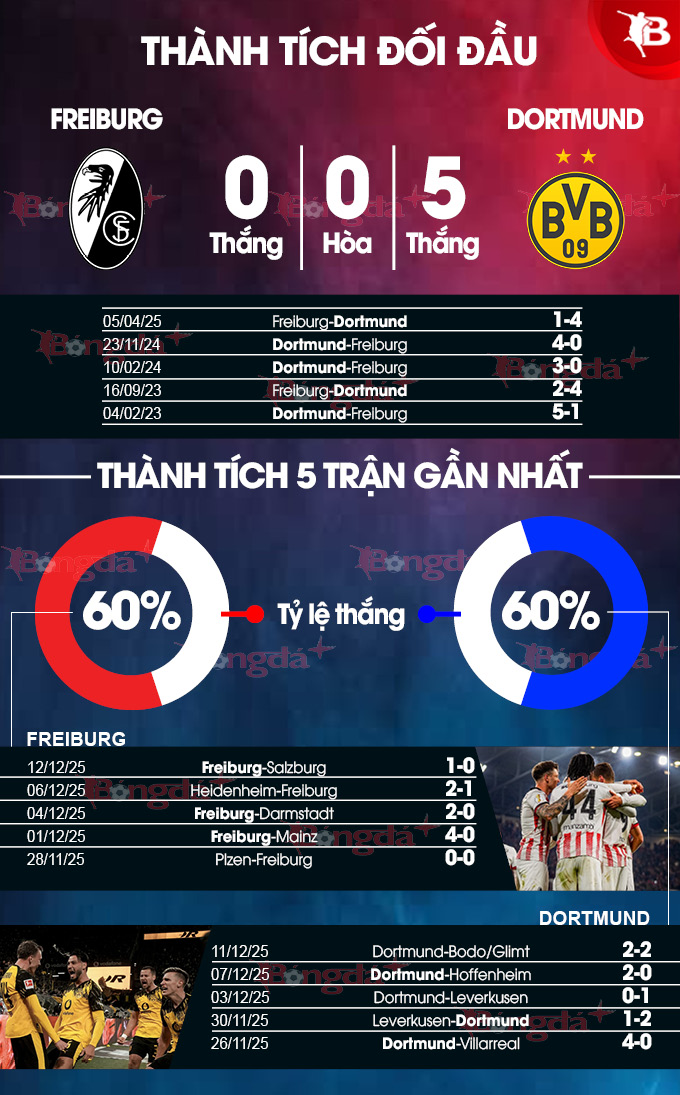 - Tối thiểu 3 bàn: 4 trận vừa qua của Freiburg ở Bundesliga đều có ít nhất 3 bàn thắng. 6/7 trận gần nhất giữa đội bóng này và Dortmund cũng diễn ra theo kịch bản tương tự.