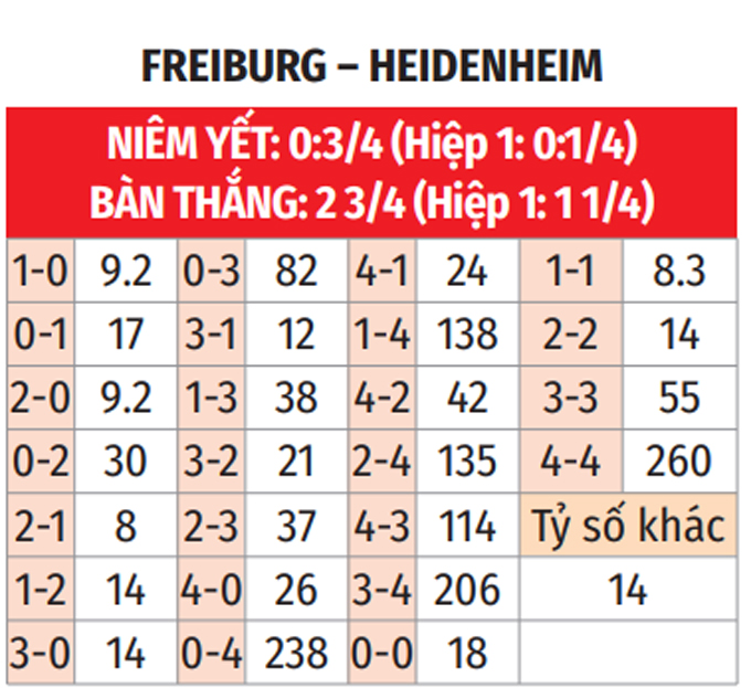 - Lẻ bàn thắng: 6/10 trận gần nhất của Freiburg có tổng bàn thắng không chia hết cho 2. Chưa hết, 6/9 trận sân khách mới đây của Heidenheim chứng kiến điều tương tự.