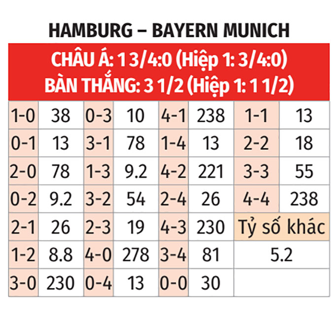 - Dưới 4 bàn: 4 trận gần đây của Hamburg đều chỉ có tối đa 3 bàn. 3 trận vừa qua của Bayern số lần lưới rung cũng đều dưới 4.