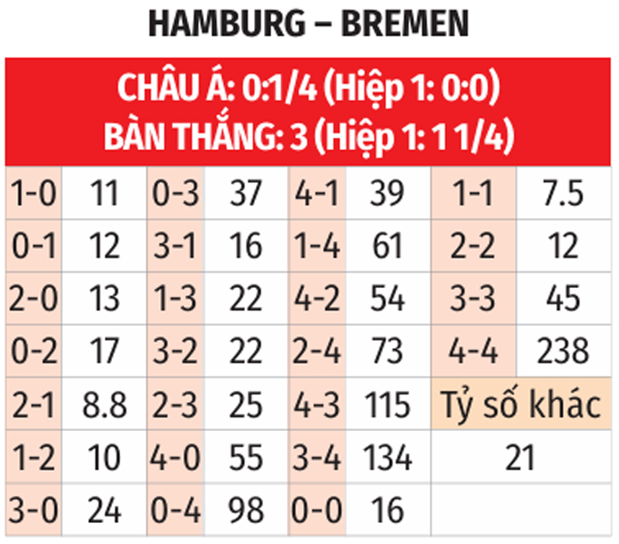 - Lưới rung 15 phút cuối: 3/5 trận gần đây so tài giữa 2 CLB có bàn thắng từ phút 75 trở đi. Chưa hết, 5/6 trận sân nhà mới đây của Hamburg và 4/5 trận vừa xong của Bremen chung kịch bản.