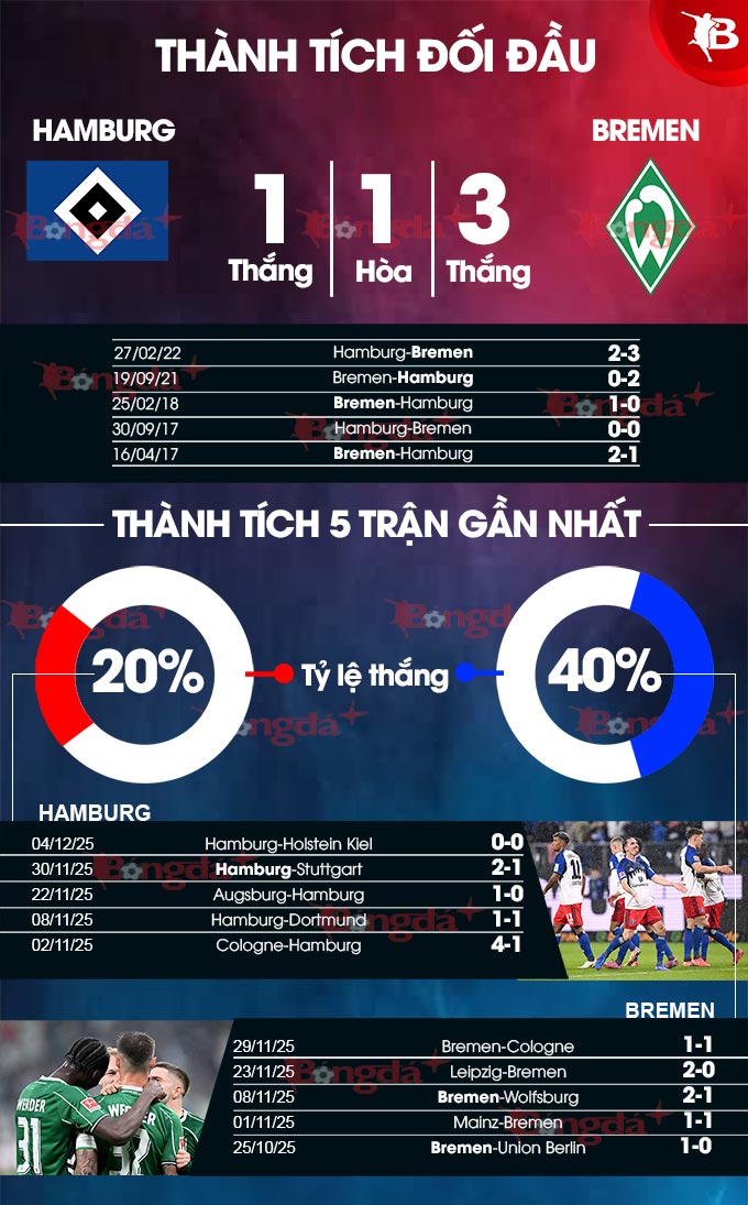 Phong độ của Hamburg vs Bremen rất chênh lệch. Hamburg có lợi thế sân nhà nhưng Bremen lại vượt trội về nhiều mặt. Nhiều khả năng, trận đấu này sẽ kết thúc với thắng lợi thuộc về Bremen.