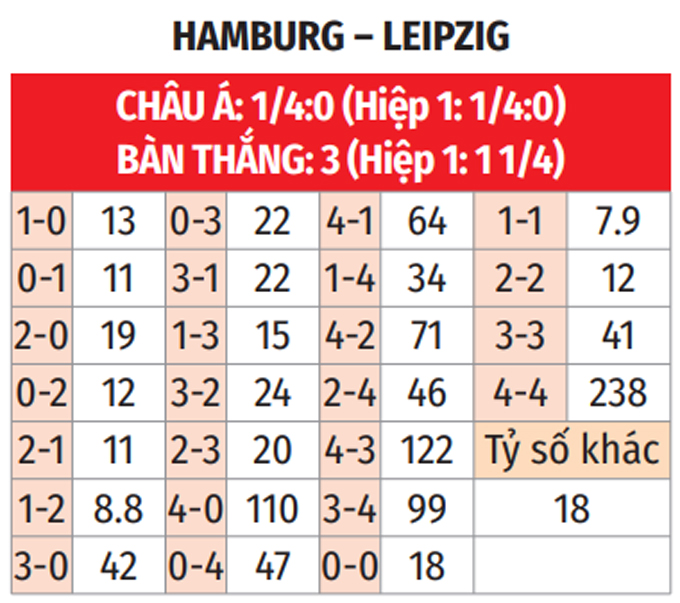 - Chẵn bàn thắng: 5/7 trận so tài gần nhất giữa Hamburg vs Leipzig có tổng bàn thắng chia hết cho 2. Chưa hết, 6/8 trận vừa xong của Hamburg lẫn 7/10 trận gần đây của Leipzig chứng kiến điều tương tự. Ngoài ra, 3 lần gần nhất khi Hamburg tiếp Leipzig trên sân nhà cũng có tổng bàn thắng chẵn.
