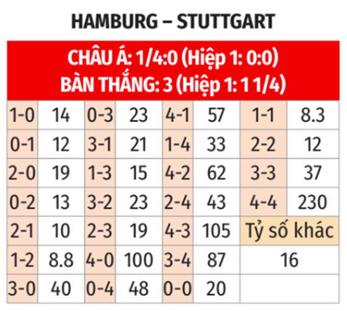 - Mưa thẻ phạt: Có tới 32 thẻ phạt ở 5 cuộc đối đầu gần nhất giữa hai đội, tương đương với bình quân 6,4 thẻ/trận. Cũng có tới 35 thẻ phạt ở 5 trận gần đây của Hamburg (7 thẻ/trận). Ngoài ra, 6 trận gần đây của Stuttgart cũng có tới 29 thẻ phạt (bình quân gần 5 thẻ/trận). Xem ra, trận cầu này nhiều khả năng sẽ có tối thiểu 4 thẻ phạt.