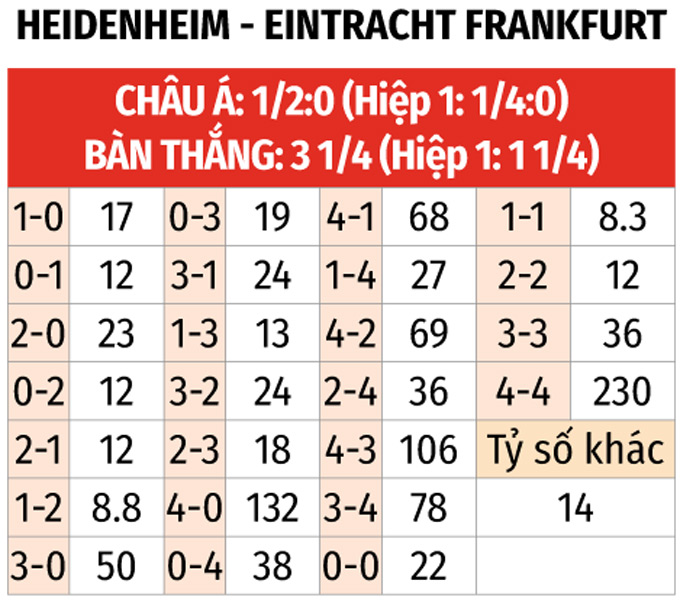 - Eintracht Frankfurt thắng châu Á hiệp 1: Eintracht Frankfurt thắng theo châu Á hiệp 1 ở 4/6 trận đấu gần đây trên sân khách. Trong khi đó, Heidenheim để thủng lưới trước ở 8/9 trận gần nhất tại Bundesliga. Lịch sử cũng chứng kiến Heidenheim toàn thua châu Á hiệp 1 ở 4 trận đối đầu gần nhất.