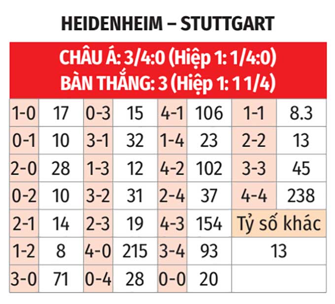 - Stuttgart thắng theo châu Á: Stuttgart thắng theo châu Á ở 4/5 trận gần nhất. Đá với Heidenheimer thua theo châu Á ở 3/4 trận vừa qua, đội chủ nhà là sự lựa chọn đáng tin cậy.
