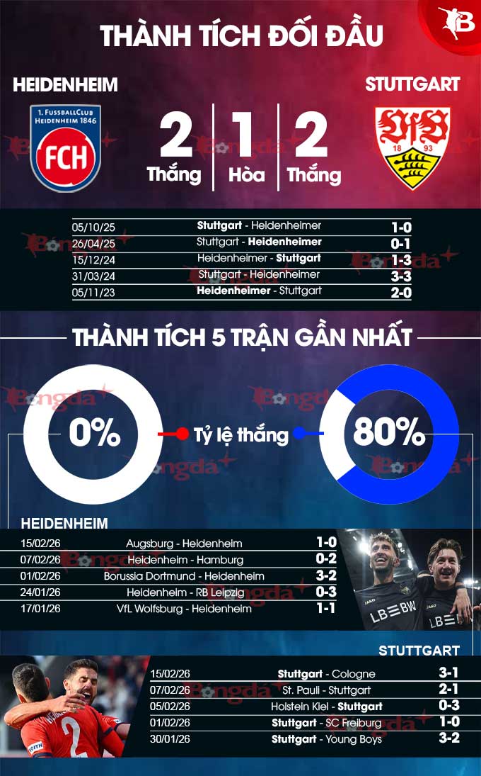 Trong khi đó, Stuttgart của HLV Sebastian Hoeness lại đang tận hưởng một mùa giải thăng hoa. Họ bước vào trận đấu Heidenheimer trong bối cảnh đang có một vị trí trong top 4 BXH. Với chiến tích giành tới 6 chiến thắng ở 7 trận gần nhất trên mọi đấu trường, Stuttgart mà không hạ nổi Heidenheimer ngay tại sào huyệt đối phương thì đây đúng là chuyện lạ.