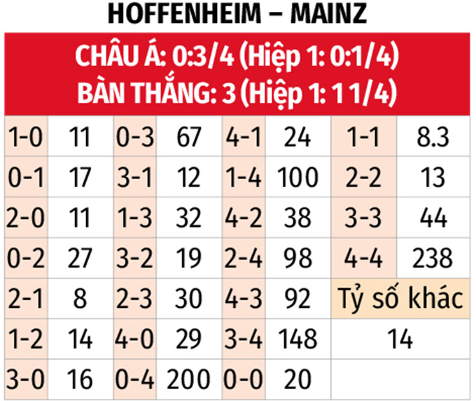 - Chẵn bàn thắng: 4/6 trận gần đây của Hoffenheim cùng 8/9 trận vừa qua của Mainz đều có tổng bàn thắng là chẵn. Kịch bản chẵn bàn thắng cũng diễn ra ở 4/5 trận đối đầu gần nhất giữa đôi bên.