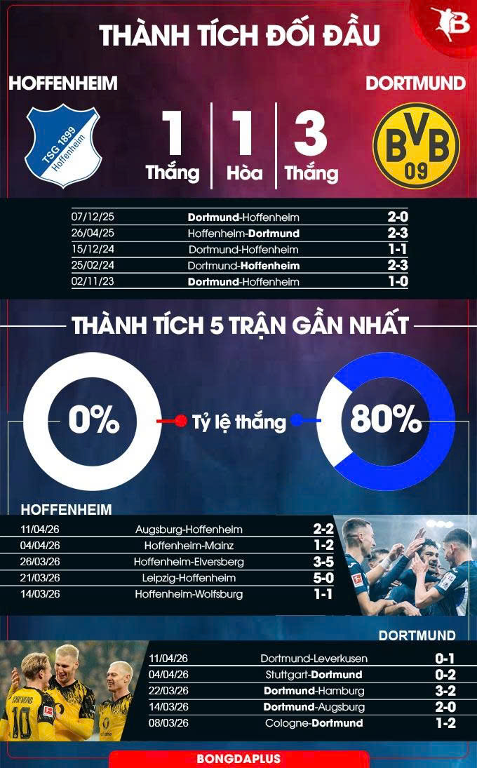 Đáng lưu ý, 5 trận vừa qua khi Hoffenheim tiếp Dortmund, họ toàn thua. Nhiều khả năng, Dortmund sẽ có lần thứ 6 liên tiếp hạ Hoffenheim khi tới sân PreZero Arena.