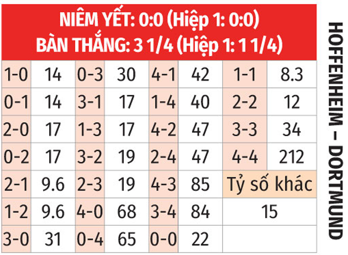 - Lẻ bàn thắng: 7/10 trận so tài gần nhất giữa hai đội có tổng bàn thắng không chia hết cho 2. Chưa hết, 6/10 trận sân nhà mới đây của Hoffenheim lẫn 5/7 trận vừa xong của Dortmund chứng kiến điều tương tự.