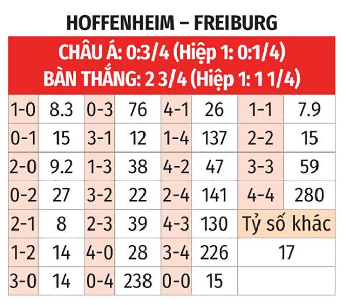 - Hoffenheim thắng theo châu Á: Hoffenheim thắng theo châu Á ở 7/8 trận gần nhất, trong khi Freiburg thua theo châu Á ở 3/4 trận vừa qua. Do đó, Freiburg không phải là lựa chọn đáng tin cậy ở trận này.
