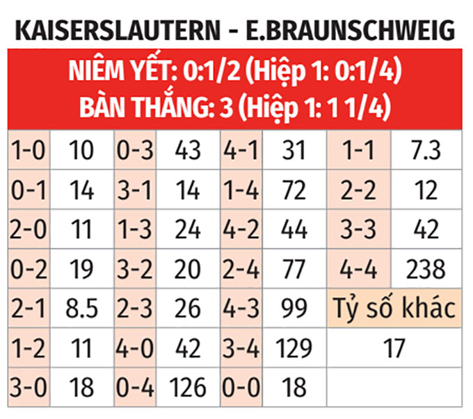 - Tỷ số lẻ: 4/6 trận gần đây của Eintracht Braunschweig đều kết thúc với tỷ số lẻ. Cả 9 trận gần nhất của Kaiserslautern cũng có số bàn thắng không chia hết cho 2.