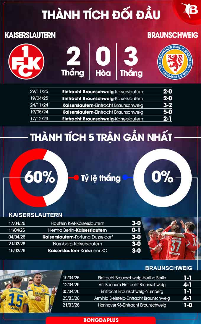 Đáng chú ý, Kaiserslautern đã kiếm trọn 3 điểm trong 2 lần tiếp đón Eintracht Braunschweig gần đây. Gặp lại đối thủ đang gặp vấn đề về phong độ, khả năng cao là họ sẽ lại buộc các vị khách phải ra về với 2 bàn tay trắng.