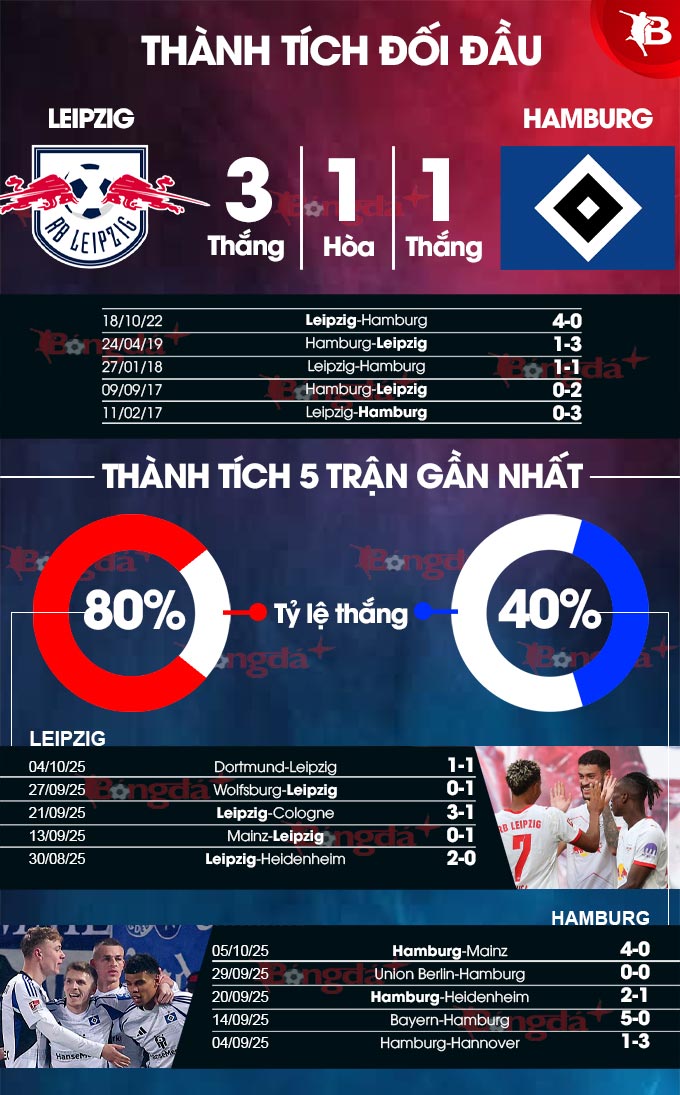 Hơn nữa, Leipzig có thành tích đối đầu ấn tượng trước Hamburg khi thắng 4, hòa 1 và thua 1 trong 6 lần đối đầu gần nhất. Với đẳng cấp vượt trội, nhiều khả năng Leipzig sẽ có 3 điểm trên sân nhà.