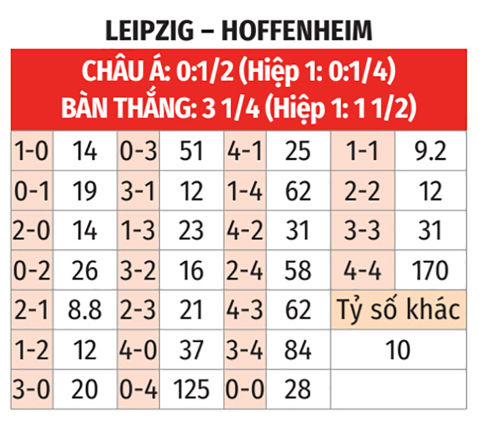 - Tỷ số chẵn: 4/5 trận gần đây giữa Hoffenheim và Leipzig đều kết thúc với tỷ số chẵn. 3/4 trận vừa qua của Hoffenheim số lần lưới rung cũng chia hết cho 2.