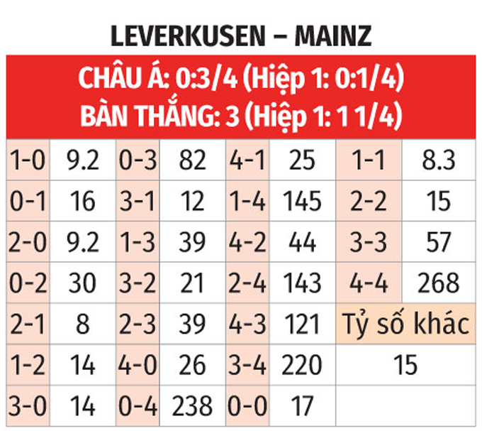 - Lẻ bàn thắng: 8/10 trận so tài gần nhất giữa Leverkusen vs Mainz có tổng bàn thắng không chia hết cho 2. Chưa hết, 4/6 trận sân nhà vừa xong của Leverkusen chứng kiến điều tương tự. Ngoài ra, 7/10 lần gần nhất khi Leverkusen tiếp Mainz trên thánh địa BayArena cũng có tổng bàn thắng lẻ.