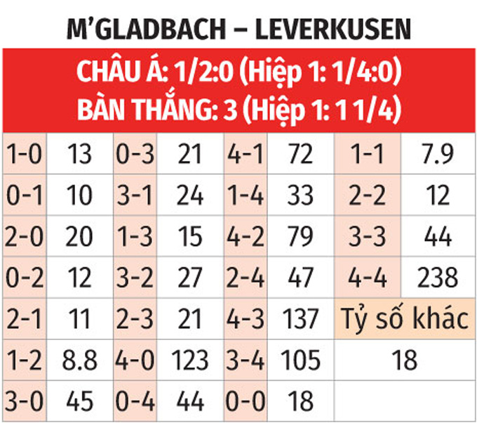 Tính đối đầu trực tiếp, M'Gladbach không có "cửa" so với Leverkusen khi thua 7 và hòa 3 ở 10 trận gần đây gặp nhau. Riêng tiếp Leverkusen trên sân nhà, M'Gladbach còn tệ hơn khi thua 9, thắng 1. Do đó, chẳng ngạc nhiên nếu 3 điểm đến với Leverkusen.