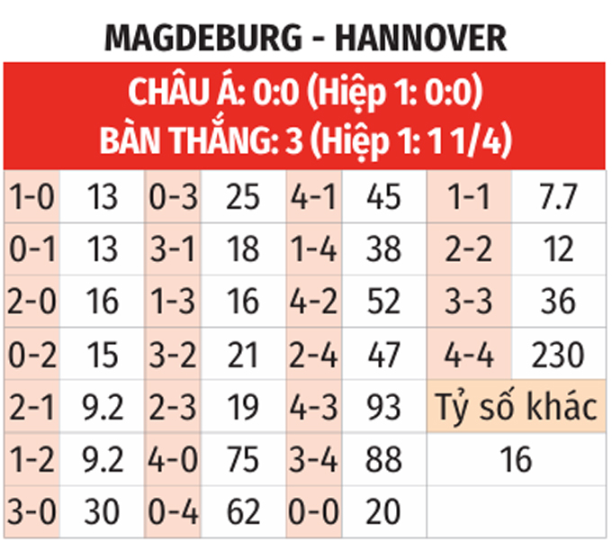- Hai đội cùng ghi bàn: Magdeburg và Hannover thành công trong việc ghi bàn ở 10 trận liên tiếp gần nhất. Bên cạnh đó, Magdeburg ghi bàn ở 6/7 trận trên sân nhà vừa qua còn với Hannover là ở 10 trên sân khách gần đây. Với xu hướng như vậy, khả năng cao hai đội sẽ cùng tìm được đường vào khung thành của nhau.