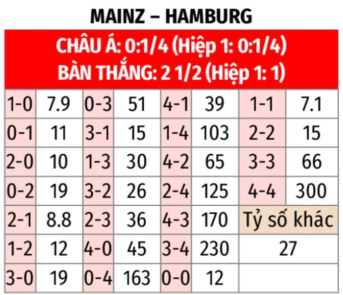 - Tối thiểu 1 bàn hiệp 1: 7/10 lần gặp giữa 2 đội gần đây đều có ít nhất 1 bàn thắng trong hiệp 1. Tình trạng tương tự xảy ra ở 7 trận gần đây của Mainz và 3 trận gần nhất của Hamburg.