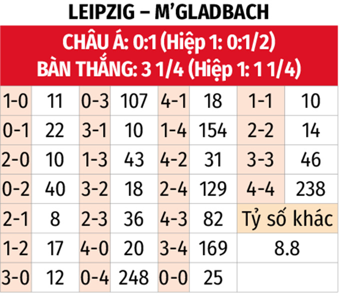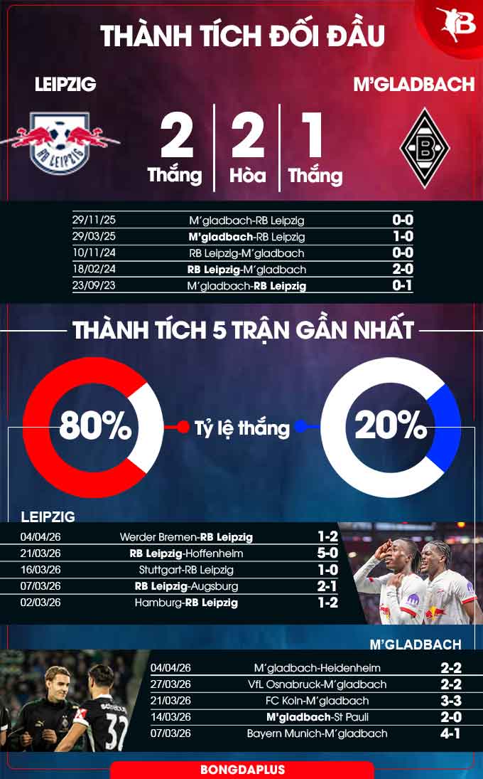 - Nhiều bàn thắng: 4/5 trận gần đây của M'gladbach đều xuất hiện ít nhất 4 bàn thắng được ghi. 3/4 trận vừa qua của RB Leipzig trên sân nhà cũng xuất hiện tối thiểu 4 pha làm bàn. RB Leipzig cũng đang sở hữu hàng công mạnh thứ 2 trên sân nhà với 34 bàn, chỉ thua đội đầu bảng Bayern Munich (56 bàn).
