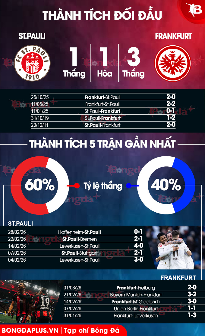 Phong độ của St.Pauli và Frankfurt đang không có sự khác biệt. Tuy nhiên, Frankfurt lại đang chơi cực dở ở sân khách. Với tình hình hiện tại, việc Frankfurt thua trên sân của St. Pauli cũng không khiến ai ngạc nhiên.